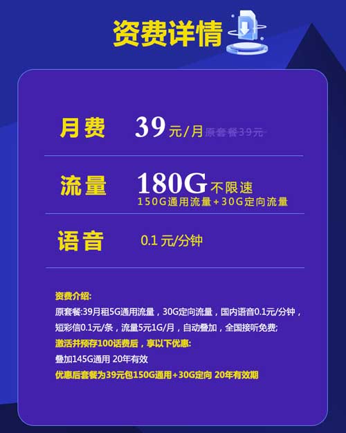 优惠后套餐为39元包150G通用+30G定向 20年有效期。