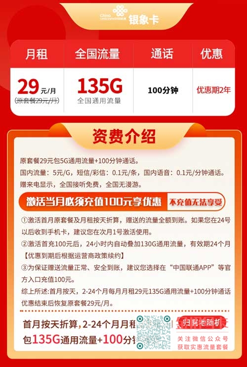 2、激活首充100元后,24小时内自动叠加130G通用流量,有效期24个月优惠到期后根据运营商政策续约。
