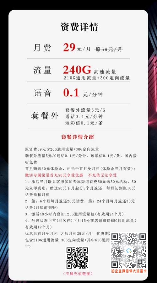 优惠后首月免月租之后月租29元/月 优惠期2年包含210G通用流量+30G定向流量(其中65G通用流量有效期一年)。