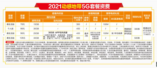 128元惠生活版套餐:128元月租,40G通用流量,30G定向流量,500分钟语音。