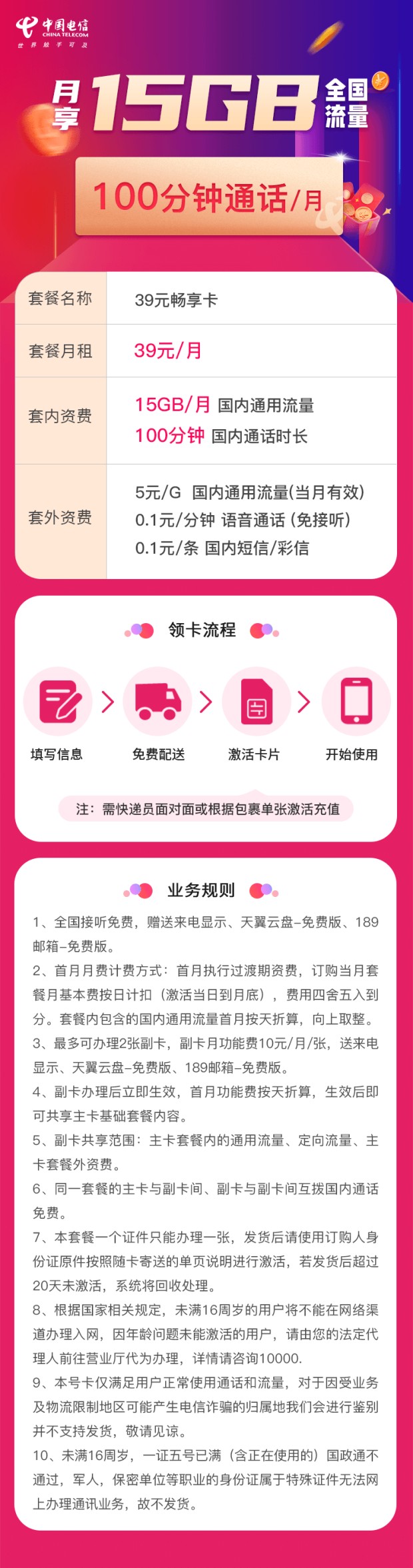 39元套餐资费:39元月租,15G国内流量,100分钟国内语音。